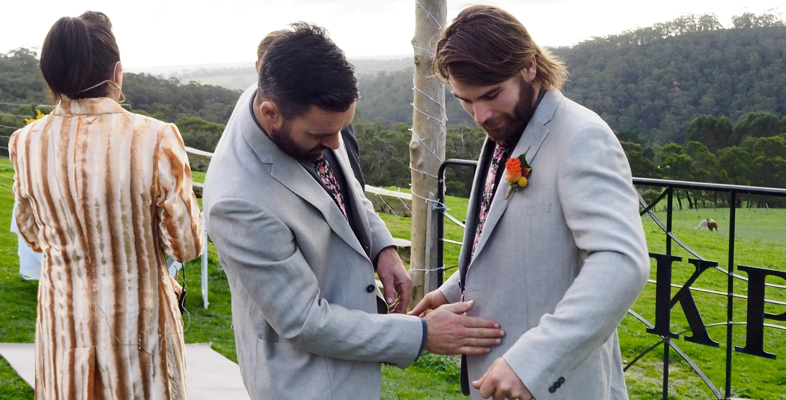 Hmm gee what an angle that aisle is, there's mud, there's rough terrain my usual back and forth organisation is a massive workout mainly focusing on not falling over, I have the groomsmen as my backup catch me I'm falling guys, guiding me from one spot to the other then back again. Ive got everyone on aisle standby for any wonky steps along the way.